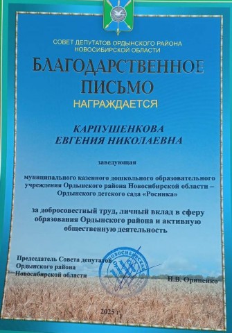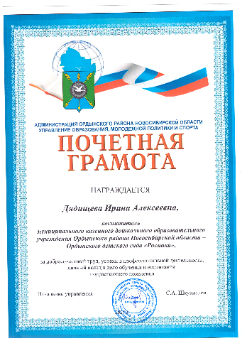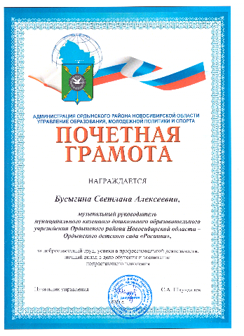 за добросовестный труд, личный вклад в сферу образования Ордынского района и активную общественную деятельность