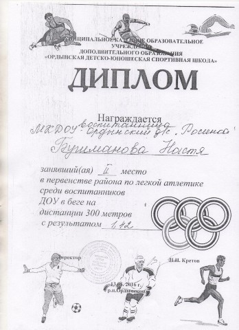 в первенстве района по легкой атлетике среди воспитанников ДОУ в беге на дистанции 300 метров с результатом 1,42